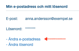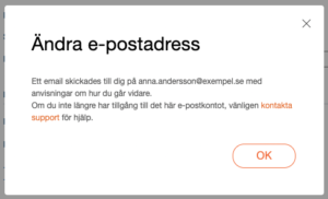 - Klart! Nu har e-postadressen uppdaterats och ett meddelande om detta skickats till både den gamla och den nya adressen. Tryck på OK för att stänga rutan.