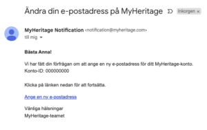 - I din inkorg ska det nu finnas ett meddelande med ämnesraden Ändra din e-postadress på MyHeritage. I det meddelandet, klicka på Ange en ny e-postadress.