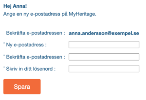 - På sidan som du nu kommer till fyller du i din aktiva e-postadress i de två översta fälten. I det nedersta fältet skriver du in ditt lösenord till MyHeritage (alltså inte ditt lösenord till e-postadressen). Klicka sedan på Spara.