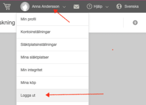 Om du använt eller använder flera e-postadresser och redan är inloggad på MyHeritage är det viktigt att du innan du börjar kontrollerar vilken e-postadress som är kopplad till ditt MyHeritage-konto. I värsta fall kan du annars bli utelåst från MyHeritage när du loggar ut, vilket du alltså ska göra enligt instruktionerna nedan.