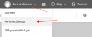 - Om du redan är inloggad på MyHeritage, klicka på ditt eget namn som du ser till höger uppe i bården på sidan och därefter på Kontoinställningar.